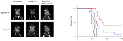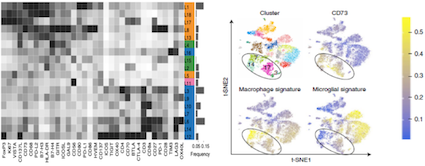 2019年12月,Nature Medicine發(fā)表對(duì)免疫檢查點(diǎn)治療效果好和不好的5種癌癥類型,共94例患者進(jìn)行單細(xì)胞蛋白和單細(xì)胞RNA測(cè)序,在多形性膠質(zhì)母細(xì)胞瘤中發(fā)現(xiàn)了一個(gè)獨(dú)特的CD73hi巨噬細(xì)胞群,在抗PD-1治療后仍然存在。通過(guò)構(gòu)建CD73敲除鼠發(fā)現(xiàn)CD73的缺失提高了抗CTLA-4和抗PD-1治療的多形性膠質(zhì)母細(xì)胞瘤小鼠模型的存活率。證實(shí)CD73是一種特異性的免疫治療靶點(diǎn),可提高多形性膠質(zhì)母細(xì)胞瘤免疫檢查點(diǎn)治療的抗腫瘤免疫應(yīng)答。