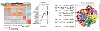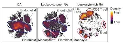2019年5月,Nature Immunology報(bào)道關(guān)于類風(fēng)濕性關(guān)節(jié)炎(RA)的研究。作者對(duì)來(lái)自RA或骨關(guān)節(jié)炎(OA)患者的51個(gè)滑膜組織樣品的T細(xì)胞、B細(xì)胞、單核細(xì)胞和成纖維細(xì)胞進(jìn)行單細(xì)胞RNA測(cè)序(scRNA-seq)、質(zhì)譜流式檢測(cè)、 轉(zhuǎn)錄組測(cè)序(bulk RNA-seq)和普通流式細(xì)胞檢測(cè)。利用基于5,265個(gè)scRNA-seq圖譜典型相關(guān)分析的綜合策略,作者鑒定了18個(gè)獨(dú)特的細(xì)胞群。通過(guò)在單細(xì)胞層面對(duì)跨數(shù)據(jù)模態(tài)進(jìn)行整合,精確定義了特定細(xì)胞亞群在RA和慢性炎癥中的作用。