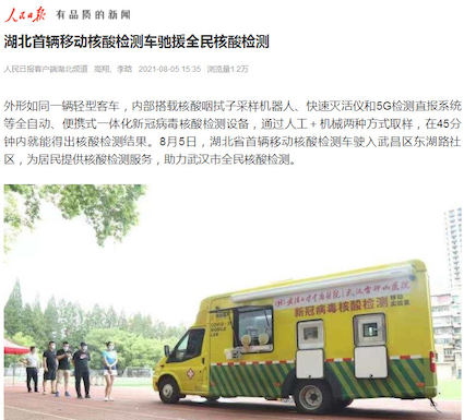 “上門檢測(cè),當(dāng)場(chǎng)就可以拿到結(jié)果?!笨崾钕?,湖北武漢有這樣一臺(tái)新冠病毒核酸檢測(cè)“神器”。它45分鐘即可完成全程實(shí)驗(yàn),最快35分鐘報(bào)告陽性結(jié)果,檢測(cè)靈敏度可達(dá)150拷貝/毫升。今天,博奧晶典原創(chuàng)的新冠病毒核酸檢測(cè)移動(dòng)實(shí)驗(yàn)室加盟武漢大學(xué)中南醫(yī)院、武漢雷神山醫(yī)院核酸檢測(cè)團(tuán)隊(duì),正式投入使用。作為湖北首臺(tái)移動(dòng)核酸檢測(cè)車,助力全民疫情防控。
