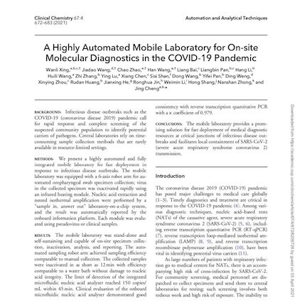 這一抗疫利器的研發(fā)成果以題為"A Highly Automated Mobile Laboratory for On-site Molecular Diagnostics in the COVID-19 Pandemic"的研究論文于2020年4月在國際檢驗(yàn)醫(yī)學(xué)界權(quán)威雜志《臨床化學(xué)》(Clinical Chemistry)重磅發(fā)表,該論文詳細(xì)闡述了“輕騎兵”的性能特點(diǎn)和檢測(cè)能力等成果,得到了國內(nèi)外廣泛關(guān)注。該項(xiàng)重量級(jí)抗疫攻關(guān)科研成果的發(fā)表,為新冠病毒核酸檢測(cè)移動(dòng)實(shí)驗(yàn)室快速部署醫(yī)療診斷系統(tǒng)提供了一種有發(fā)展前景的解決方案,有助于控制新冠病毒的區(qū)域性傳播。