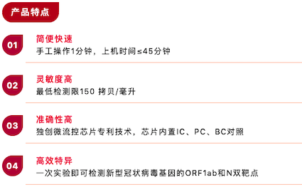 基于全新一代先進(jìn)的芯片實(shí)驗(yàn)室(Lab-on-a-chip)設(shè)計(jì)理念,化繁為簡(jiǎn),檢測(cè)時(shí)僅需將樣本保存液加入芯片,封閉芯片后即可上機(jī),手工操作小于1分鐘。生物反應(yīng)全程(包括核酸提取、核酸純化、擴(kuò)增反應(yīng)、核酸檢測(cè)和結(jié)果判讀等)均集成在一個(gè)整體密閉、內(nèi)部分區(qū)的微流控芯片內(nèi),由全自動(dòng)核酸分析儀完成,因此無需專業(yè)分區(qū)實(shí)驗(yàn)室,無需人工干預(yù),最大程度降低操作人員感染及樣本間交叉污染的風(fēng)險(xiǎn)。45分鐘完成實(shí)驗(yàn)全過程,最快可在35分鐘內(nèi)檢出新冠陽性樣本,檢測(cè)靈敏度可達(dá)150拷貝/毫升,在截至目前國(guó)內(nèi)獲批的同類產(chǎn)品中靈敏度最高,真正實(shí)現(xiàn)“樣本進(jìn)-結(jié)果出”。