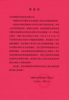 我縣諾爾鎮(zhèn)貧困殘疾戶學(xué)生xxx父親雙目失明,其本人先天性高度近視,家庭生活貧困。在我縣殘聯(lián)及本地企業(yè)內(nèi)蒙古哈維斯特農(nóng)牧科技有限公司對其家庭一對一幫扶的過程中,得到了貴公司的大力支持。2022年2月18日,xxx同學(xué)在貴公司進(jìn)行生物基因檢測期間,貴司減免了其全部檢測費(fèi)用,并且得到了貴司員工悉心的照顧和幫助。是你們熱情的問候以及無私的援助,讓xxx同學(xué)感受到社會大家庭的溫暖,讓她有戰(zhàn)勝疾病克服困難的決心和意志。貴司專業(yè)的服務(wù)和先進(jìn)的基因檢測技術(shù),對xxx同學(xué)及其家庭未來的生活有很大幫助。貴司的仁愛之心和社會責(zé)任感為和諧社會做出了優(yōu)秀的榜樣!