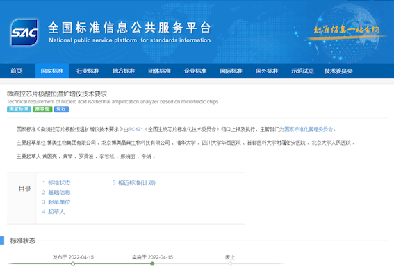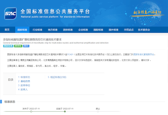 近日,國家市場監(jiān)督管理總局、國家標準化管理委員會發(fā)布《中華人民共和國國家標準公告》2022年第6號和第8號,由博奧生物集團有限公司主導制定的國家標準《微流控芯片核酸恒溫擴增儀技術(shù)要求》(GB/T 41407-2022),《多指標核酸恒溫擴增檢測微流控芯片通用技術(shù)要求》(GB/T 41521-2022)獲準頒布,分別于2022年4月15日、2022年7月11日起正式實施。兩項新標準的頒布完善了我國核酸擴增檢測技術(shù)領(lǐng)域的標準內(nèi)容,使相關(guān)技術(shù)所涉及產(chǎn)品應用與服務更加規(guī)范、具有較強的指導性。