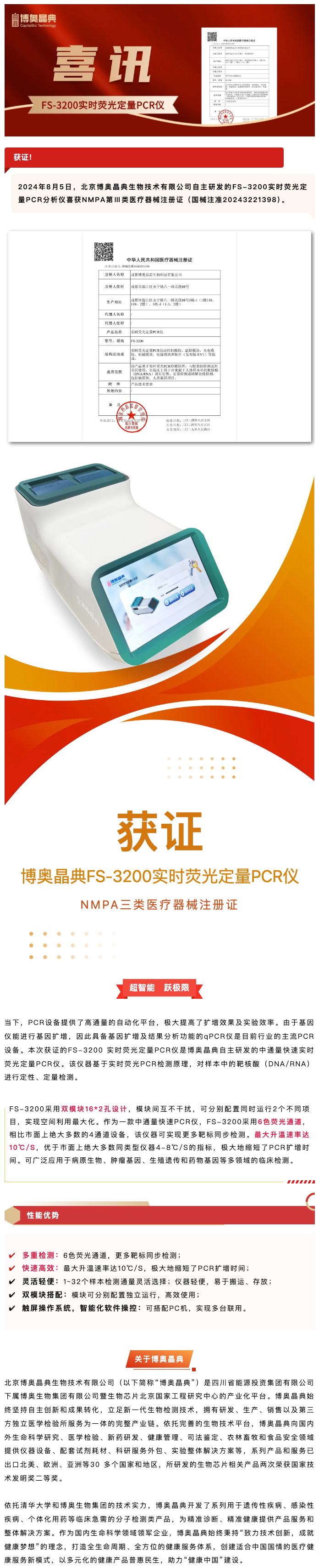 喜訊丨博奧晶典FS-3200實時熒光定量PCR儀獲NMPA三類醫(yī)療器械注冊證!